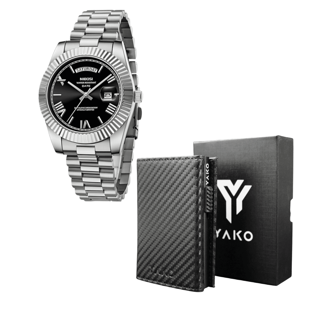 Descubre el combo perfecto de YAKO: un reloj y una billetera tarjetero premium. Viene con packaging YAKO listo para obsequiar.