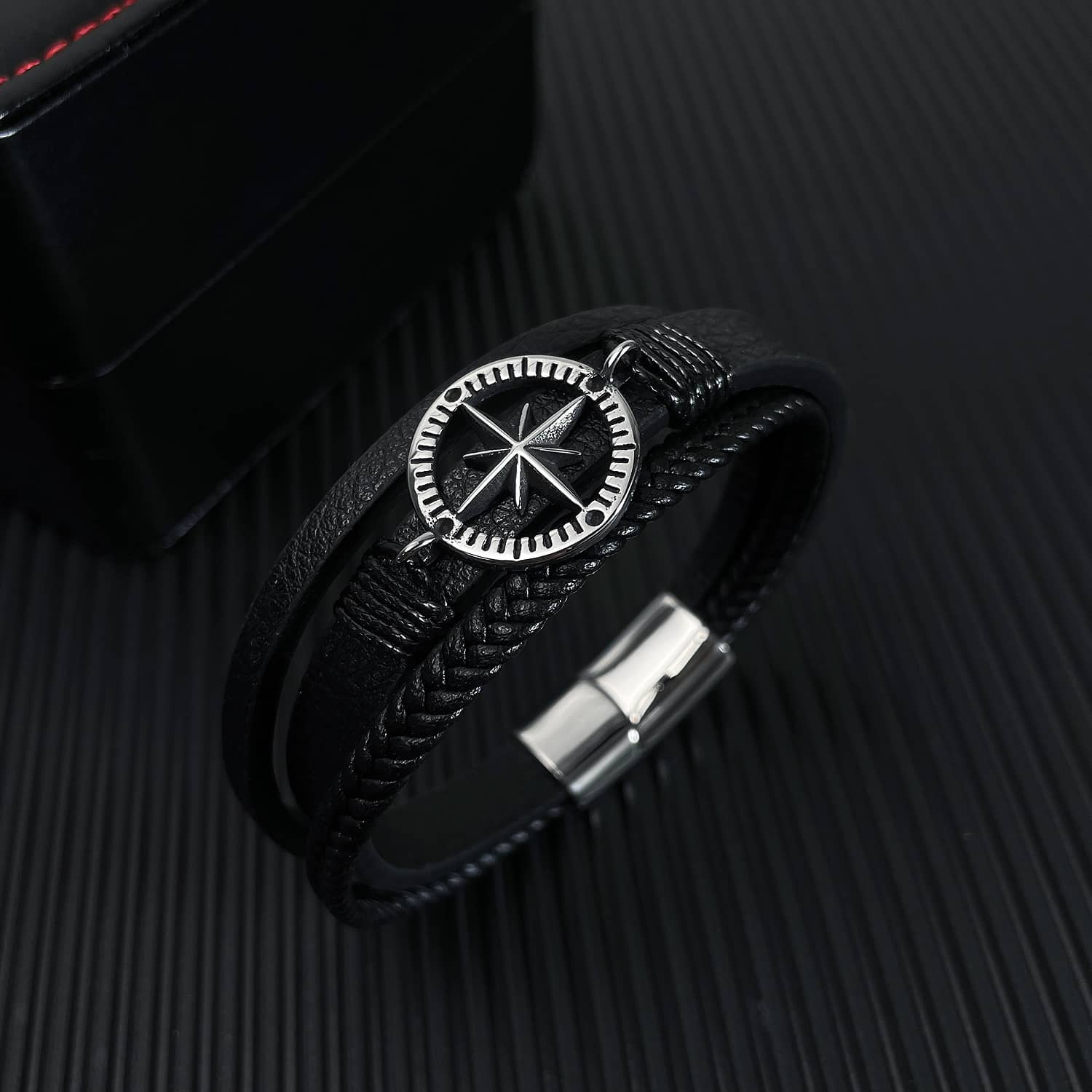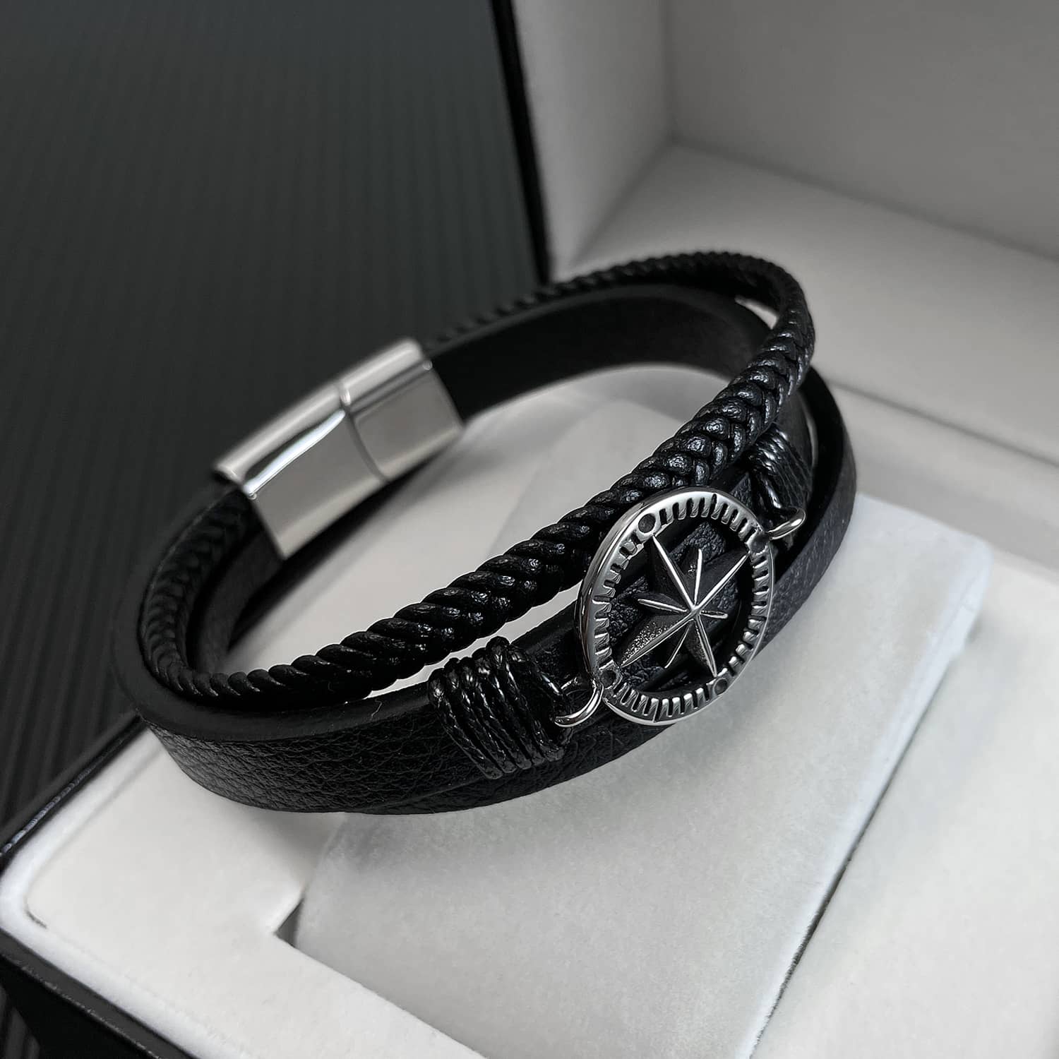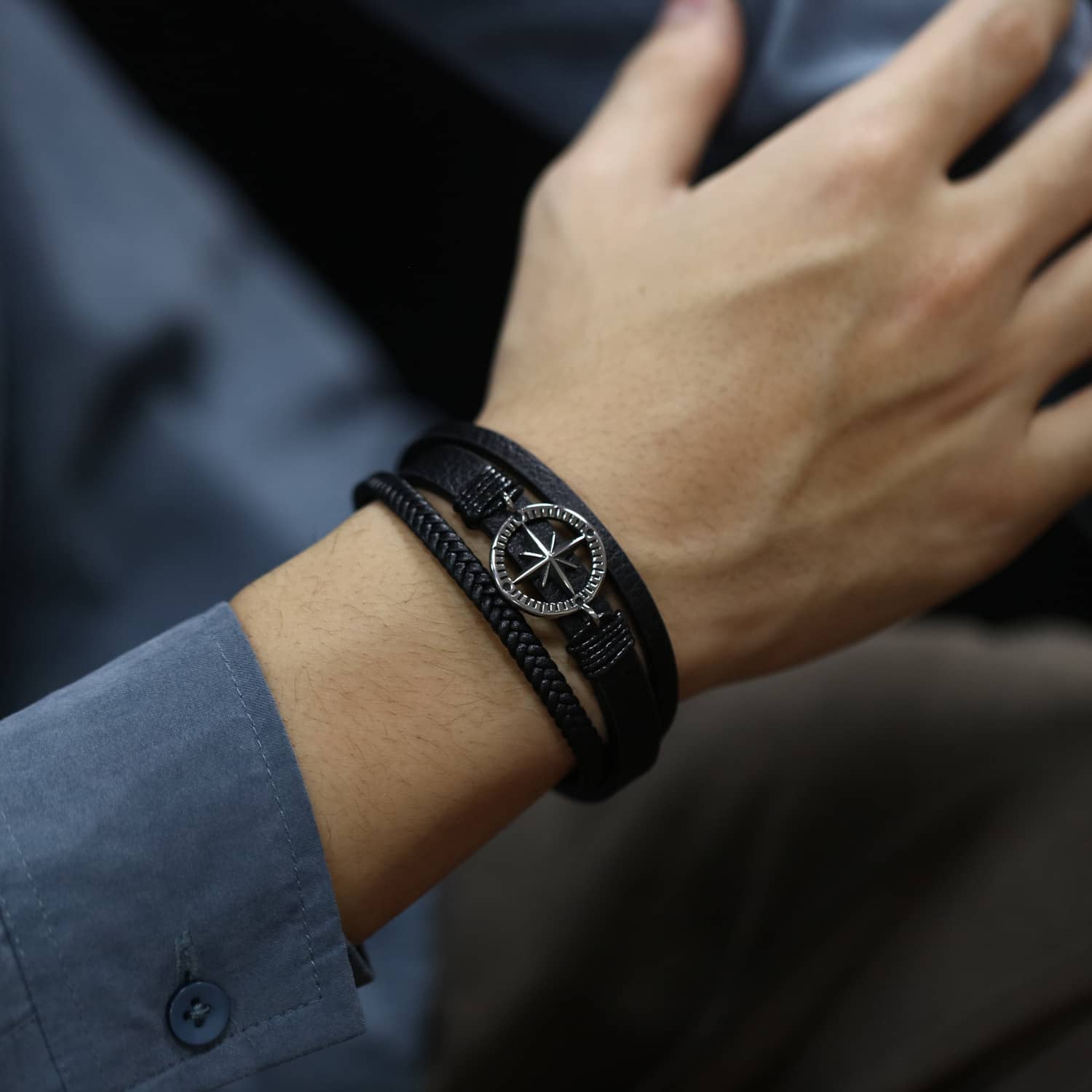 Pulsera masculina en cuero negro con detalle de brújula en acero. Diseño moderno, cómodo y resistente, ideal para quienes buscan un accesorio con estilo y personalidad.