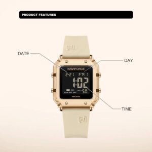 Este modelo Naviforce combina una caja dorada de aspecto premium con una correa beige suave y cómoda, logrando un estilo moderno que destaca sin exagerar.