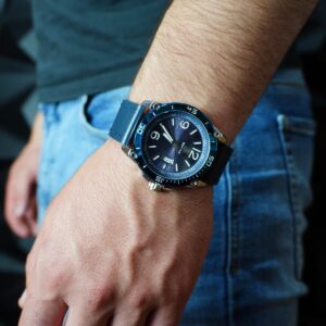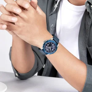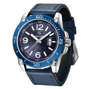 Este reloj Benyar para hombre combina elegancia y versatilidad. Con una sofisticada esfera azul y un bisel a juego, su diseño se destaca por su modernidad y robustez. Los números arábigos grandes y las manecillas aseguran una fácil lectura, mientras que la ventana de fecha añade funcionalidad. La correa de cuero brinda comodidad y un toque moderno, perfecto para cualquier ocasión.