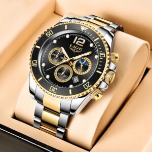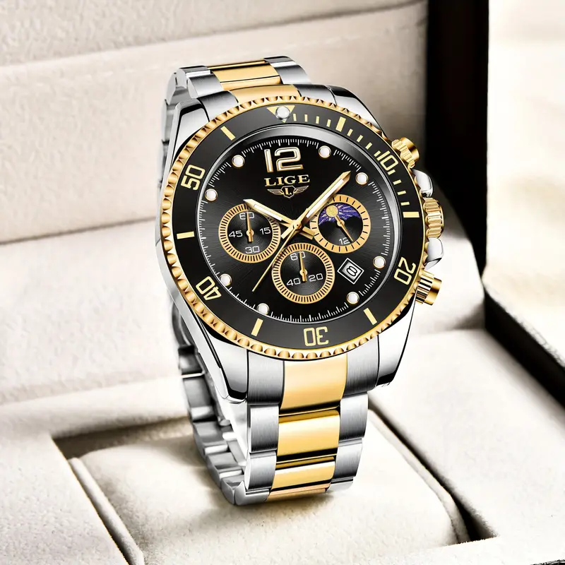 Acero plateado con acentos dorados y bisel negro. Se siente sólido, seguro y elegante sin esfuerzo.