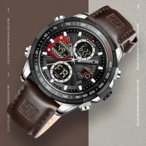 El reloj Naviforce brinda una impresionante unión de tecnología de doble pantalla, con visualización numérica y analógica, que permite una lectura rápida y exacta del tiempo. Adicionalmente, incluye luz que asegura una fácil visibilidad en situaciones de escasa iluminación. El temporizador y calendario integrados son prácticos instrumentos para llevar el control del tiempo y las fechas relevantes. La malla de cuero de alta calidad asegura una sensación cómoda y agradable al contacto con la piel. Con un diseño vanguardista y refinado, es el accesorio perfecto para cualquier actividad cotidiana.