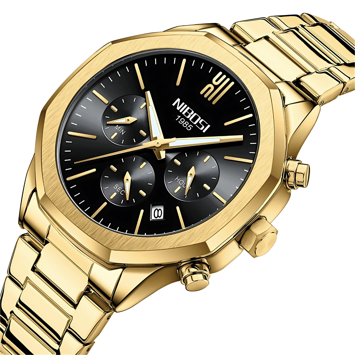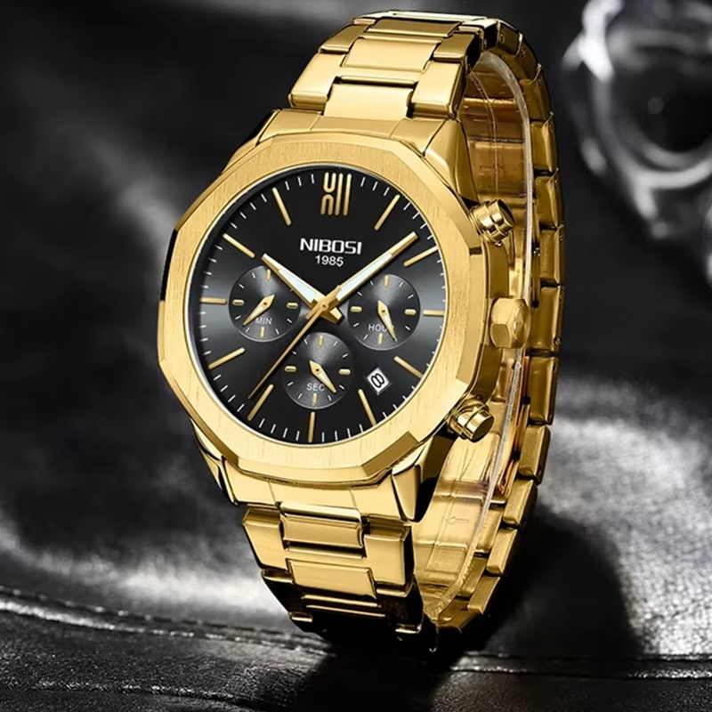 Un diseño imponente y sofisticado, ideal para quienes buscan destacar con estilo. Su acabado metálico dorado y esfera negra combinan modernidad y carácter.